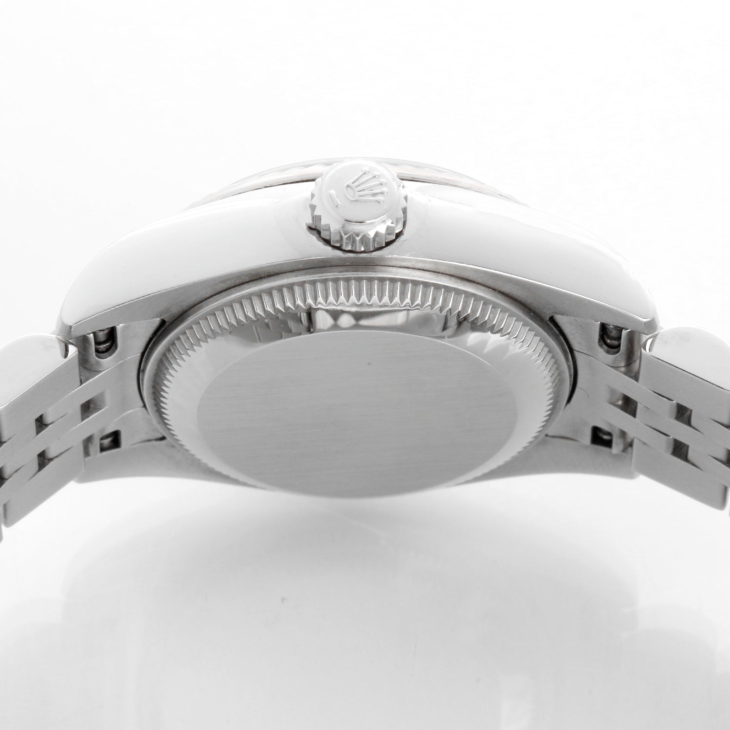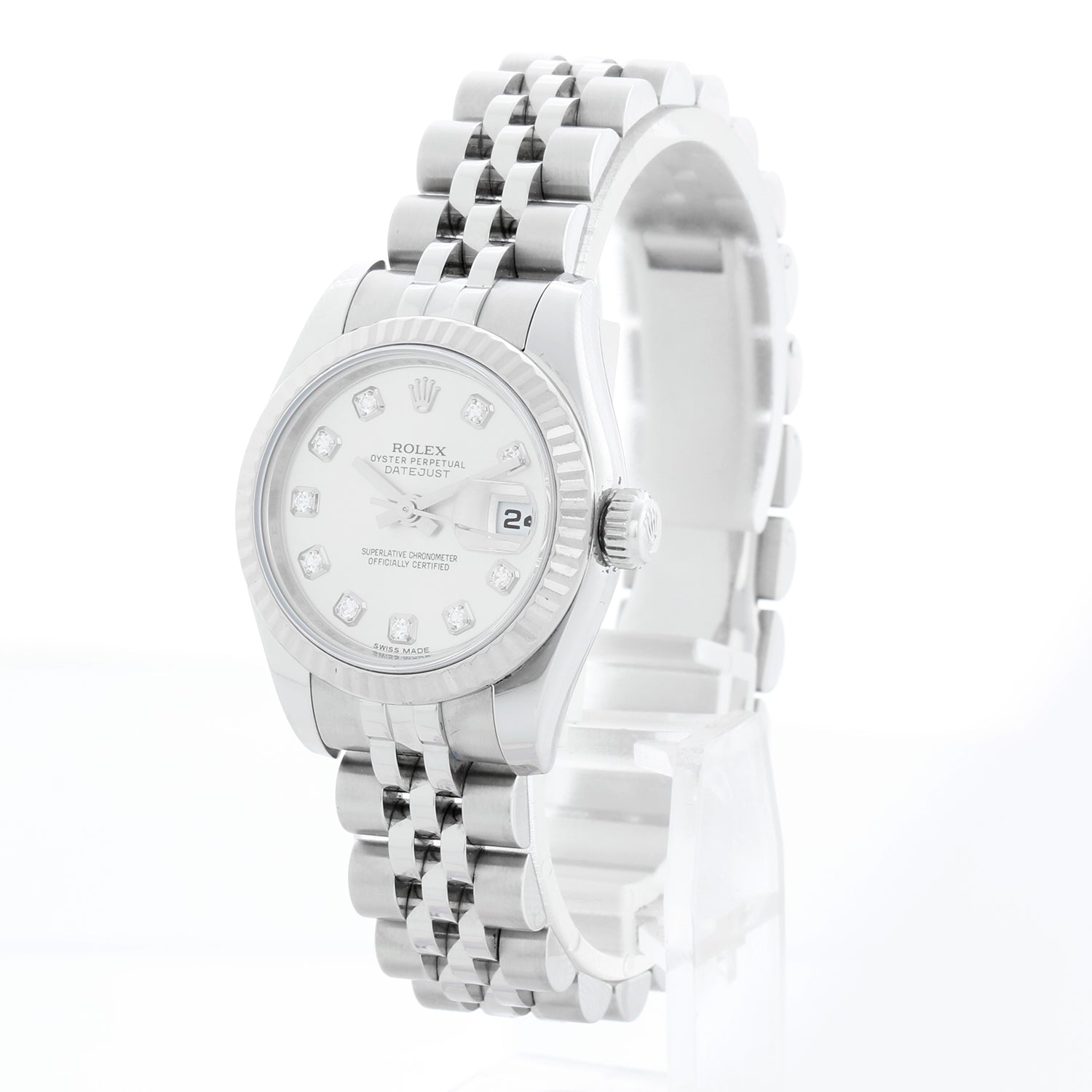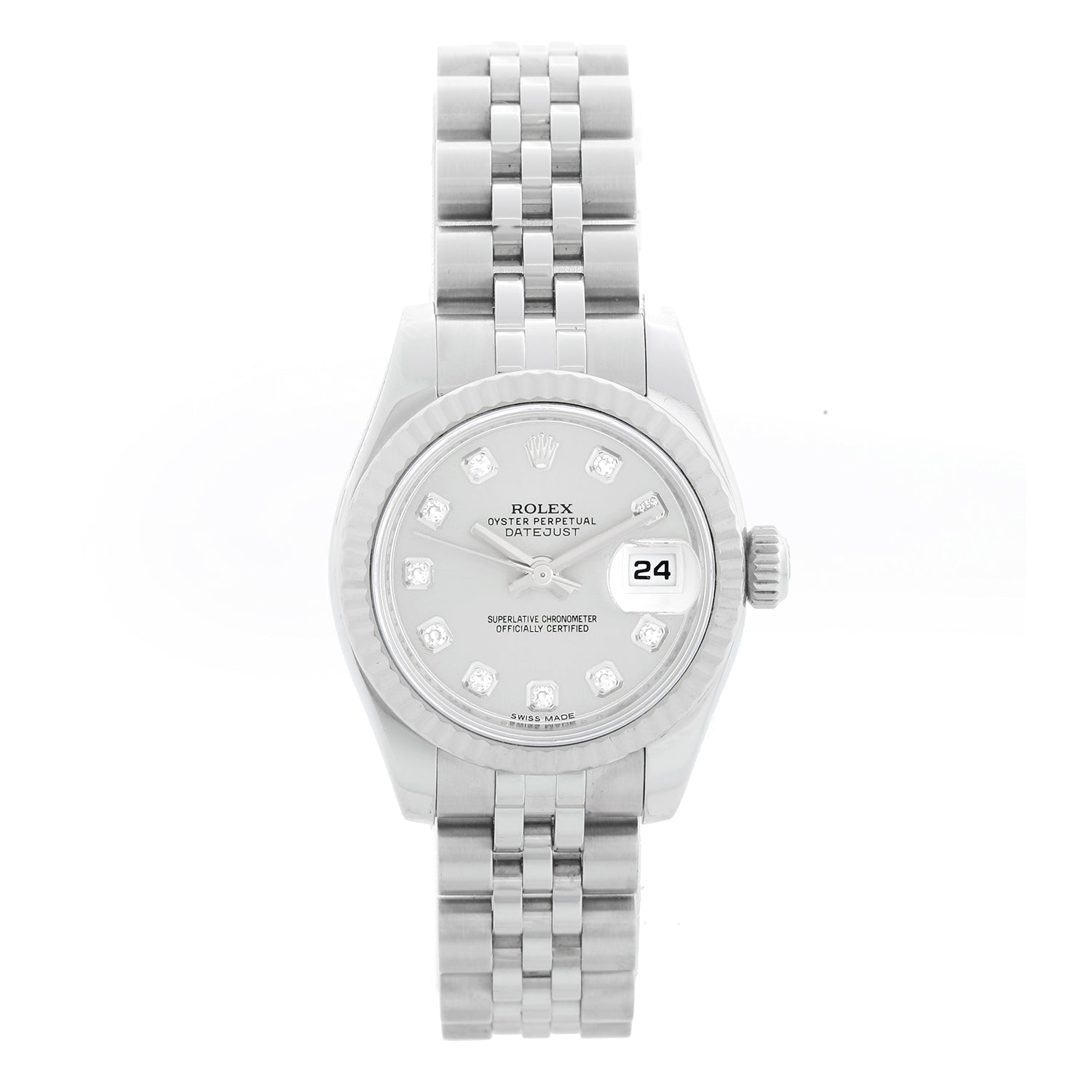 Rolex Lady Datejust Stainless Steel Ladies Watch 179174 - Automatic winding; 31 jewel; sapphire crystal. Lady Datejust. Stainless steel case with 18k white gold fluted bezel (26mm diameter). Silver dial with factory diamond hour markers. Stainless steel hidden-clasp Jubilee bracelet. Pre-owned with card and books card dated 2015.