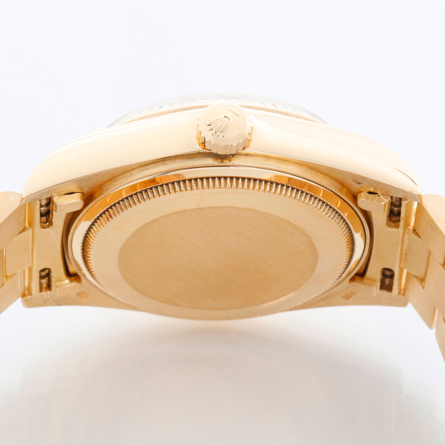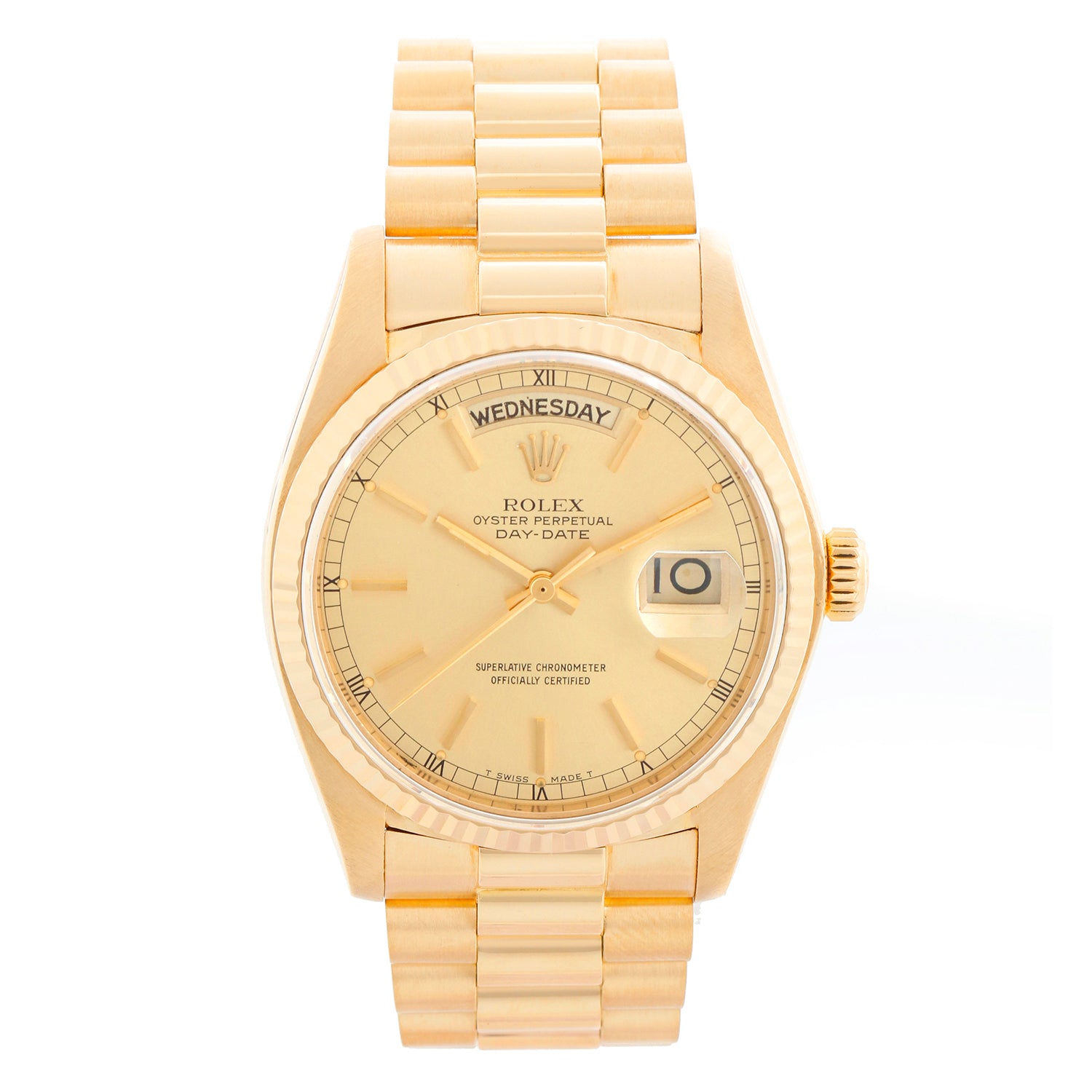 Rolex President Model 18038, - Men's 18k yellow gold wristwatch (36mm diameter). Champagne tapestry dial with 18k yellow gold fluted bezel. 18k yellow gold hidden-clasp President bracelet. 31 jewel superlative officially certified chronometer movement. Pre-owned with Rolex travel box and book