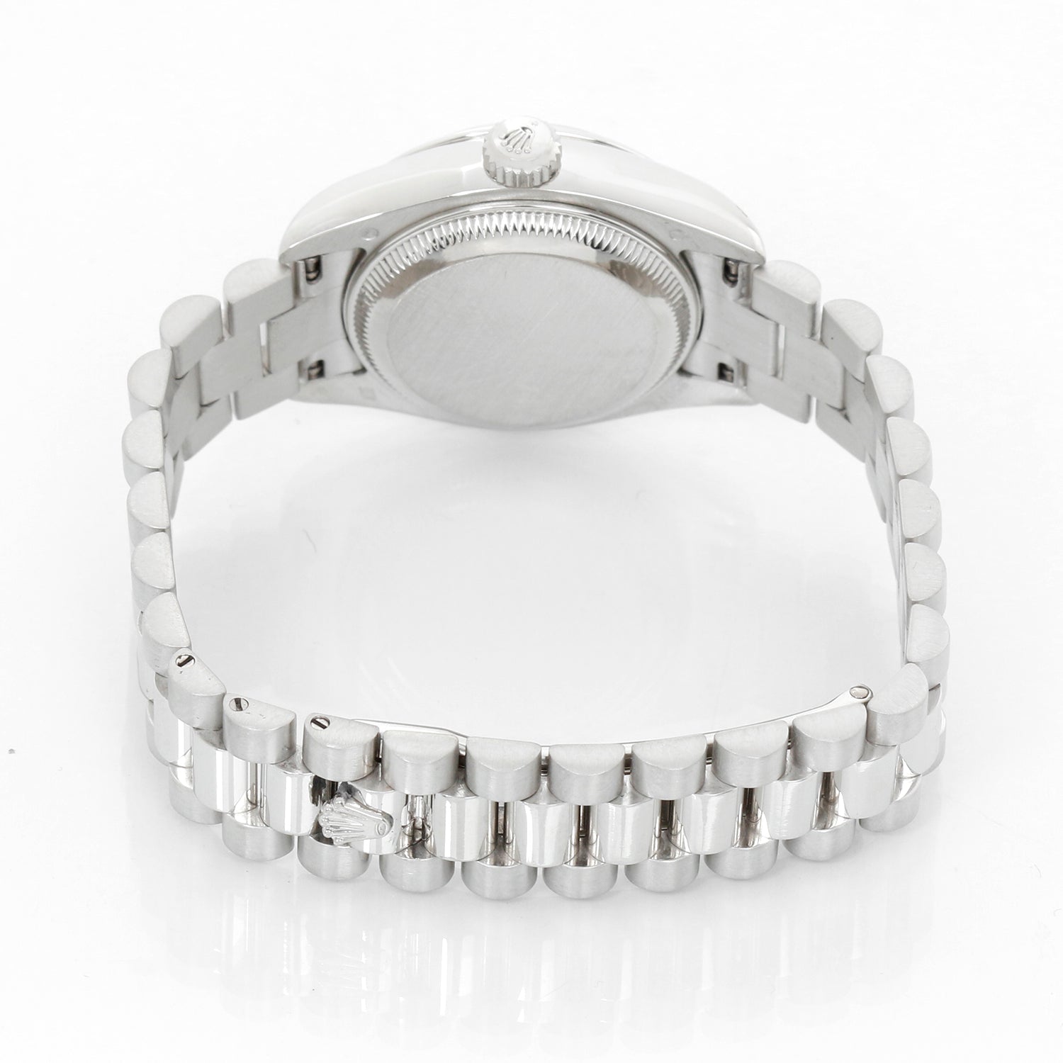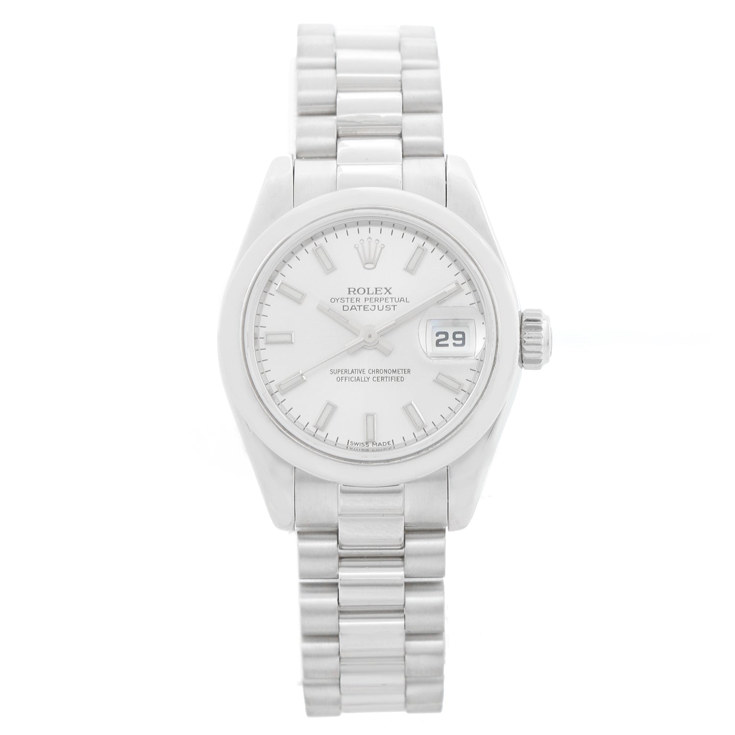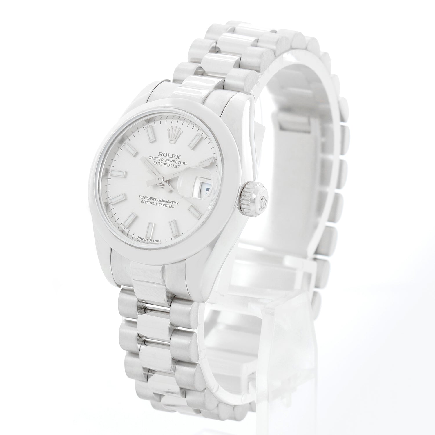 Rolex Ladies Platinum President 179166 - Automatic winding, Quickset date, sapphire crystal. Ladies President. Platinum case with smooth bezel (26mm). Silver dial. Platinum President bracelet with hidden clasp. Pre-owned with Rolex Box.