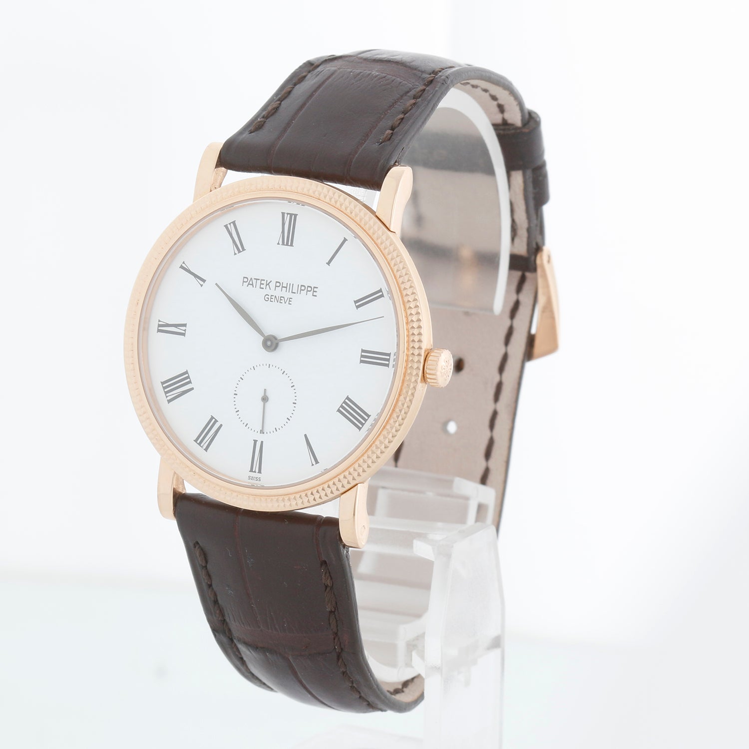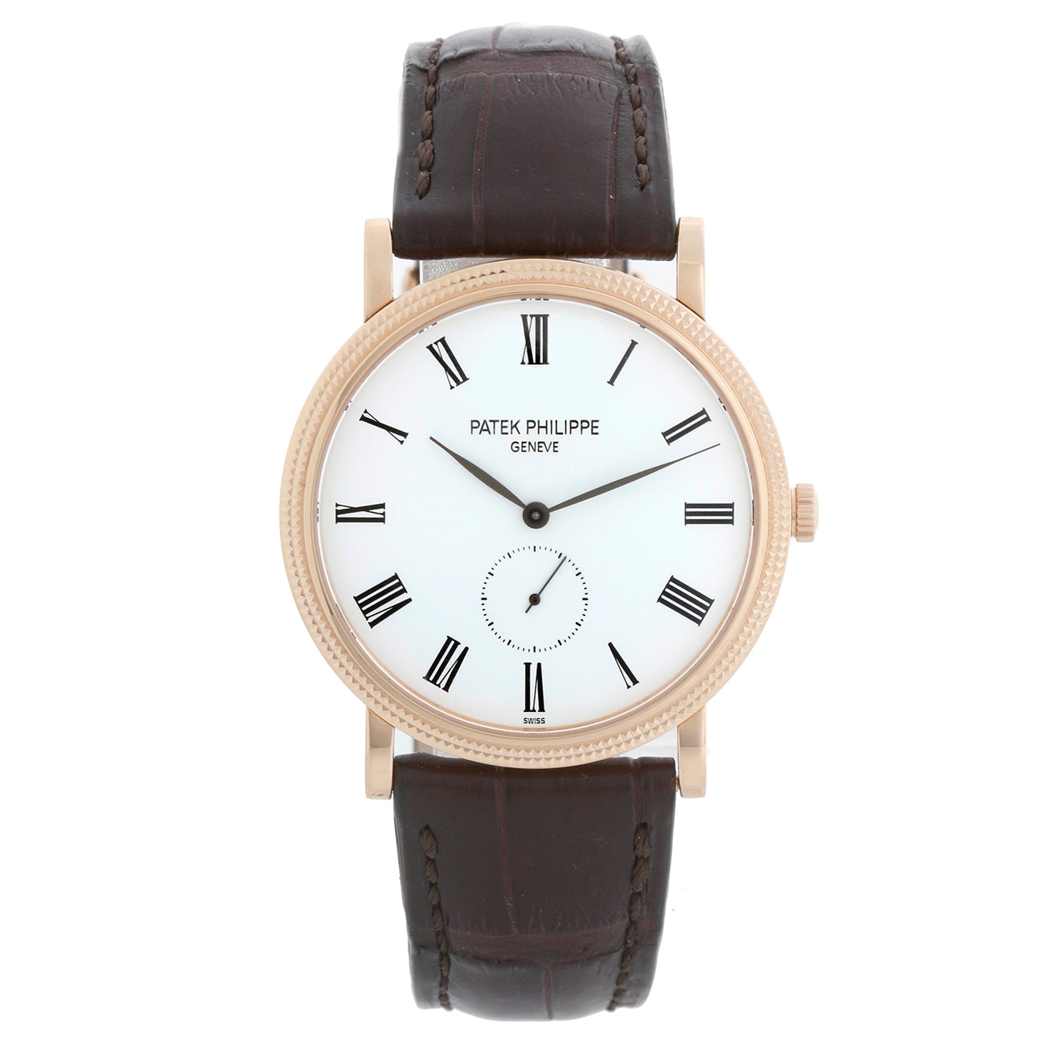 Patek Philippe Calatrava 18k Rose Gold Men's Watch 5119-R (or 5119R) - Manual winding. Calatrava. 18k rose gold case with hobnail bezel and exposition back (36mm diameter). White dial with black Roman numerals; subseconds at 6 o'clock. Patek Philippe strap band with 18k rose gold Patek Philippe tang buckle. Pre-owned with Patek Travel pouch and papers. Dated 2008.