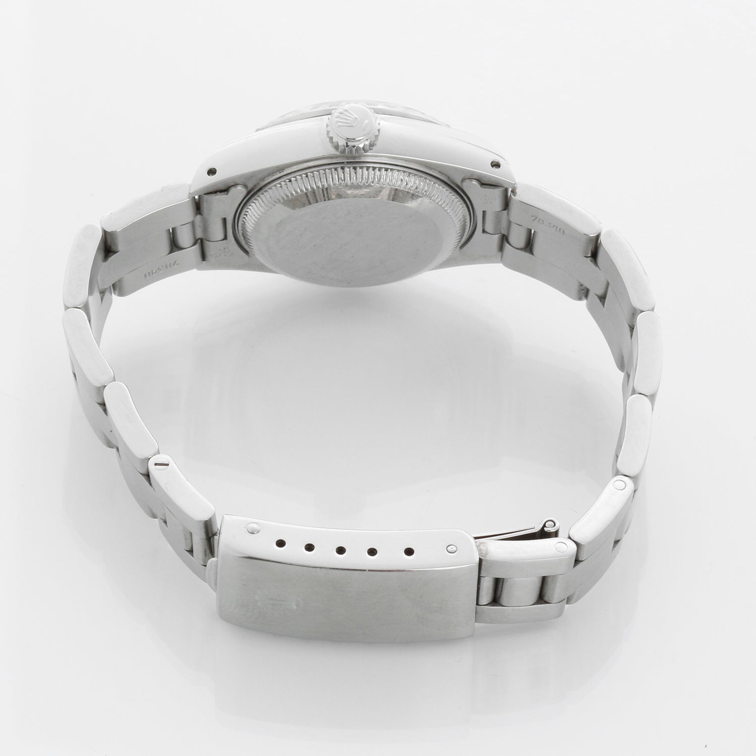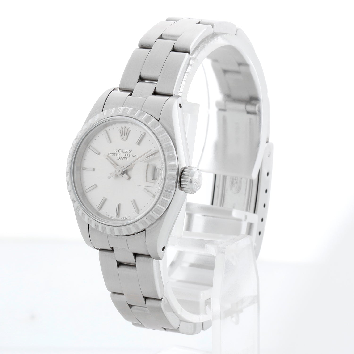 Rolex Date Model 69240, - Ladies stainless steel wristwatch with date display (26mm diameter). Engine turned bezel. Silver dial with raised stick markers. Stainless steel Oyster bracelet. Pre-owned with custom box.