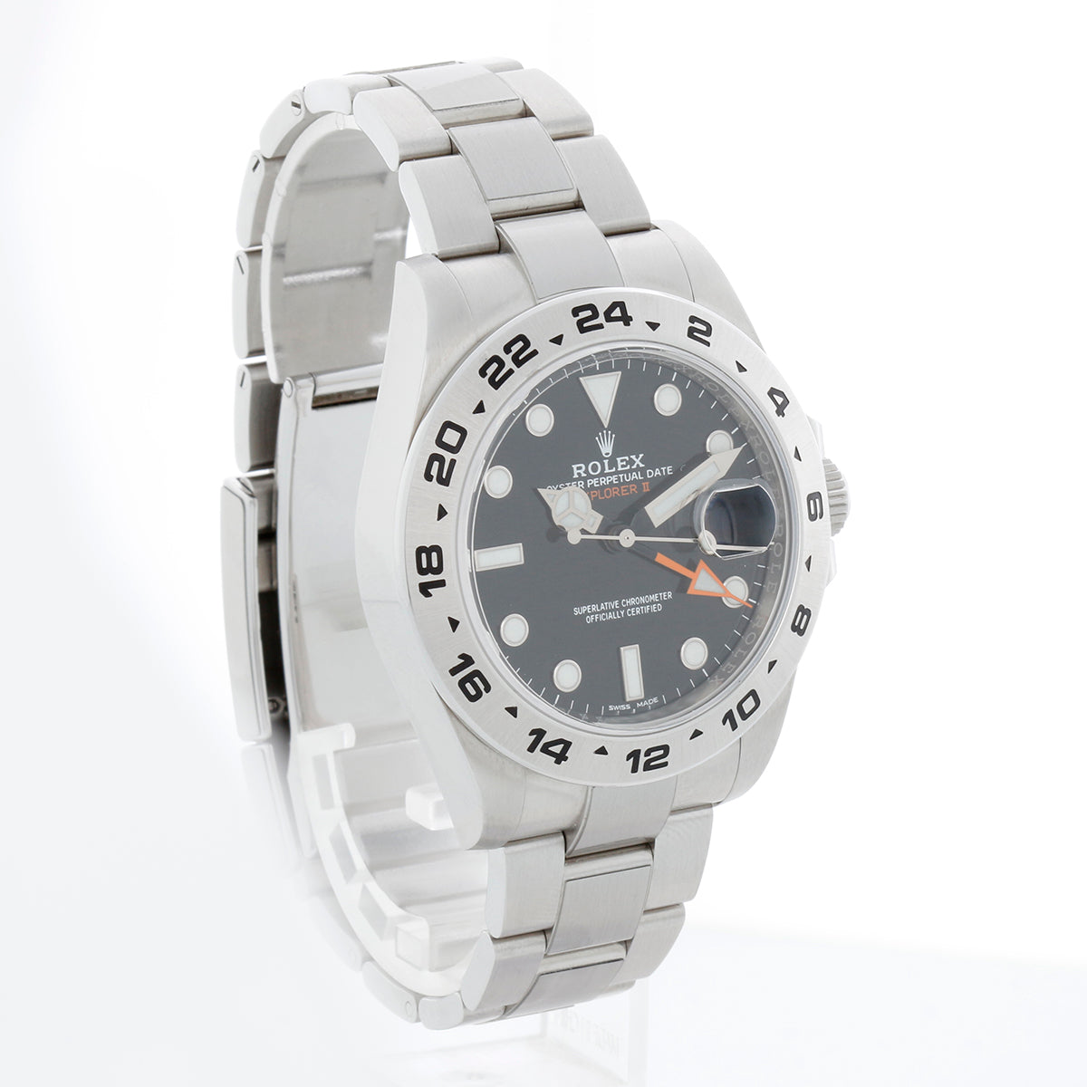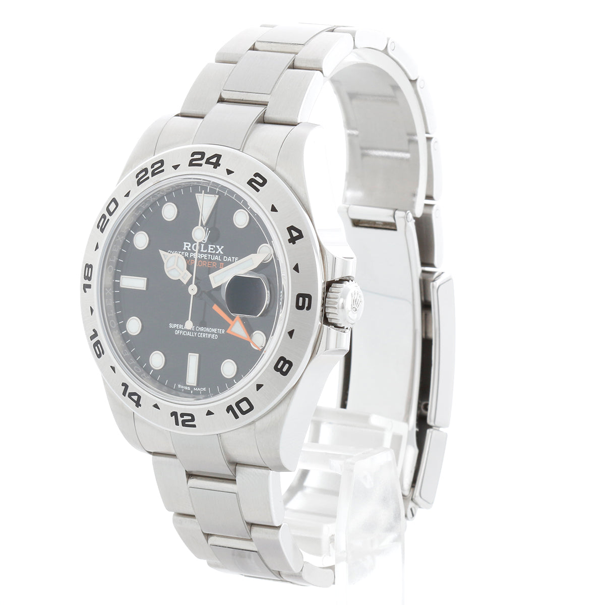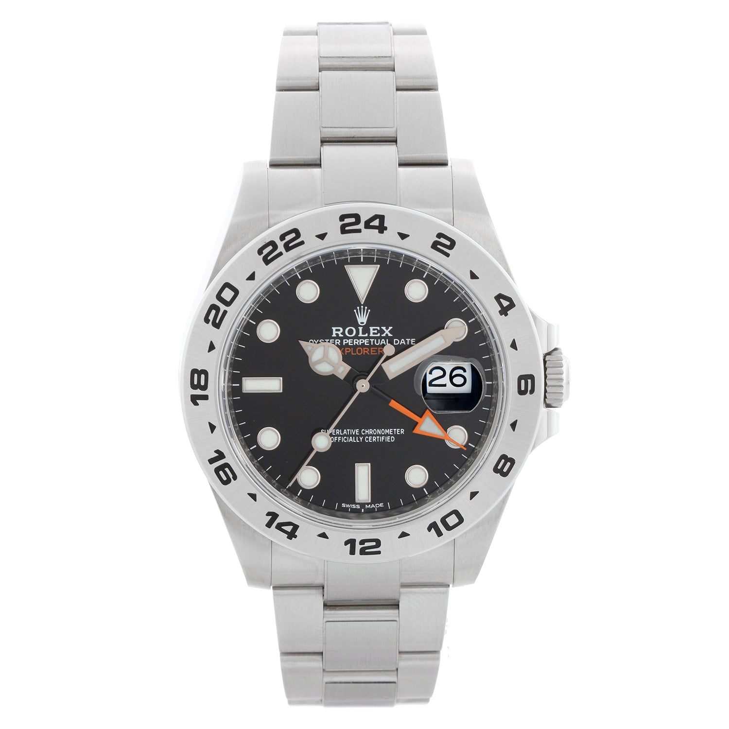 Rolex Explorer II Men's Stainless Steel Watch 216570 Black Dial with Date - Automatic winding, 31 jewels, Quickset, sapphire crystal, dual time. Explorer II. Stainless steel case (42mm diameter). Black dial with white markers. Stainless steel Oyster bracelet with flip-lock clasp. Pre-owned with Rolex box and card. Dated 2019.